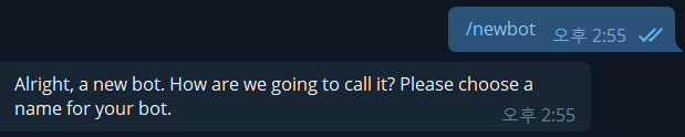 해당 채팅창에 /newbot을 치게되면 다음과 같은 메세지가 나옵니다.